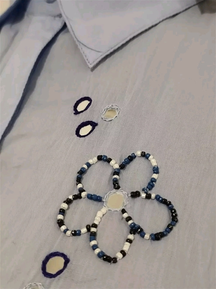 Destello bead embellishment embroidery lace trim button collar shirt mini Dress