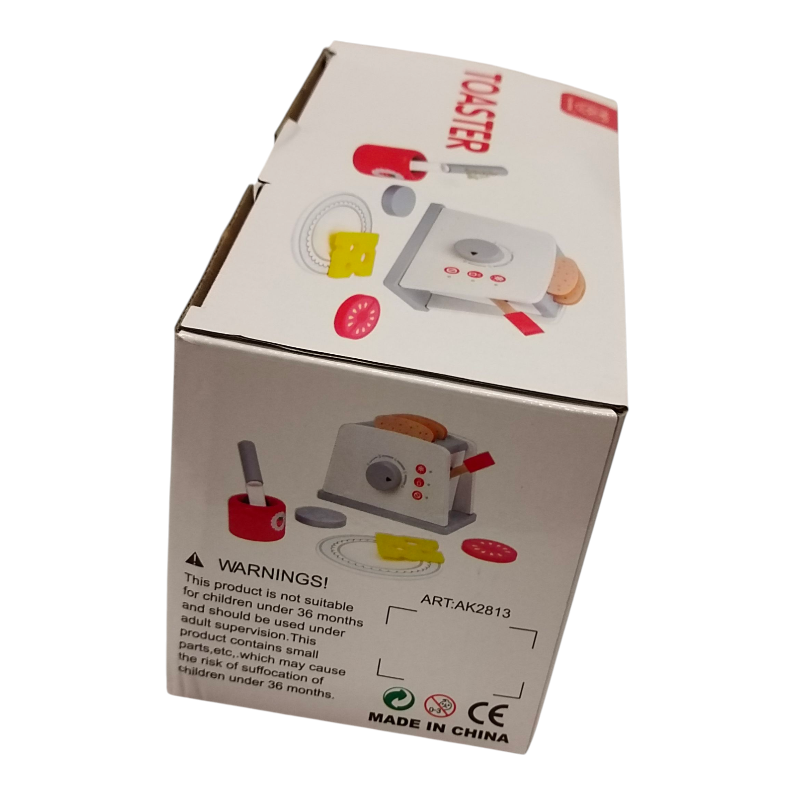 This Kids Wooden Toaster Pretend Role Play Kitchen Cooking Toy Set helps to develop manual skills and teach meal preparation, an educational toy for children aged 36 months plus.